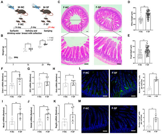 3.1. Maternal Surfactin Administration Enhances Offspring Intestinal Development and Intestinal Innate Mucosal Immunity