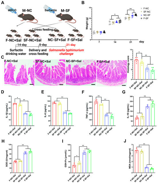 Maternal surfactin administration mitigates intestinal inflammatory injury in offspring. (n = 6) (A) Experimental design. 1. Negative control dams who fed negative control pups (F-NC); negative control dams who fed surfactin-treated pups (NC-SF); 3. surfactin-treated dams who fed negative control pups (SF-NC); 4. surfactin-treated dams who fed surfactin-treated pups (F-SF). Pups were challenged with 1 × 109 CFU of Salmonella typhimurium (Sal) at 21 days. (B) Body weight of pups was scored on days 7, 14, and 21 before Salmonella typhimurium infection. (C) HE staining revealed histopathological changes in ileum tissues, and histologic scoring is detailed in Materials and Methods. Scale bar is 100 μm. (D–G) ELISA-detected levels of IL-1β, IL-6, TNF-α, and IL-10. (F–J) SOD, GSH-Px, and MDA concentrations in ileum tissues. Data are expressed as mean ± SD (* p < 0.05; ** p < 0.01).