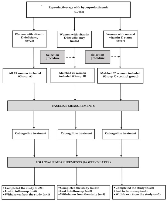 Depending on plasma 25-hydroxyvitamin D levels, the participants were assigned to one of three study groups. Group I included vitamin D-naive individuals with vitamin D insufficiency (25-hydroxyvitamin D levels between 20 and 30 ng/mL). Group II consisted of males with normal calciferol status (25-hydroxyvitamin D levels between 30 and 60 ng/mL) receiving vitamin D supplementation (50–100 μg daily) because of previous vitamin D deficiency/insufficiency. Group III (the reference group) included vitamin D-naïve men with 25-hydroxyvitamin D levels between 30 and 60 ng/mL. For ethical reasons, vitamin D-naïve subjects with 25-hydroxyvitamin D levels below 20 ng/mL were not considered for enrollment. Prospective sample size calculation showed that at least 20 individuals per group were needed in order to detect a 20% between-group difference in all measured risk factors with 80% power at the 5% level of significance. The number of participants in each group was increased to 24 (by 20%) in order to account for possible losses and withdrawals. All vitamin D-naive individuals with vitamin D insufficiency meeting the remaining inclusion and exclusion criteria participated in the study. In turn, only some men with normal vitamin D status were recruited in order to match the study groups for age, body mass index (BMI), and baseline testosterone concentrations (Figure 1). The participating men were selected using an algorithm based on the minimum Euclidean distance rule. To minimize the effect of seasonal variation in levels of 25-hydroxyvitamin D and maybe also in levels of other outcome measures, similar numbers of men were recruited between January and March (6 in groups I and III and 7 in group II), between April and June (6 in each group), between July and August (7 in group I, 5 in groups II and III), and between September and December (5 in group I, 6 in group II, and 7 in group III).