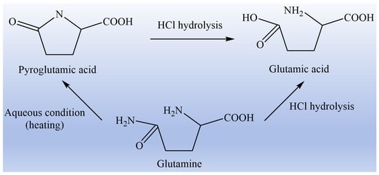 Based on the various physiological functions of glutamine, corresponding food, drugs, or functional health products can be researched and developed according to the different needs of different people [,]. Despite its widespread pharmaceutical use, glutamine remains underutilized in food products due to the limitations of glutamine monomer itself, which is reflected in the following three aspects: first of all, glutamine monomer is easily converted to toxic pyroglutamic acid under heating conditions, and it is also extremely unstable in aqueous solution, which is easily decomposed to glutamic acid and ammonia. The transformation diagram of glutamine to glutamic acid and pyroglutamic acid is shown in Figure 1. Secondly, glutamine has low solubility in aqueous solution due to its side chain having no charge. Third, the human body is prone to allergic reactions to glutamine, such as nausea, vomiting, shock, and poor adaptability [,,]. Therefore, it is of critical practical significance to find suitable and stable substitutes for glutamine.