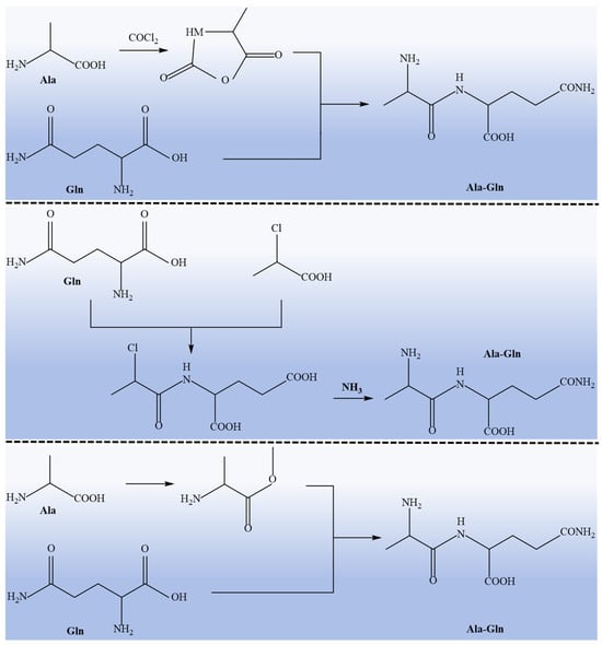 There are two main methods for the preparation of glutamine peptides: one is chemical synthesis, which combines glutamine with other amino acids to synthesize glutamine peptides according to needs. The commonly used synthesis methods are liquid-phase synthesis and solid-phase synthesis. The liquid-phase synthesis method depends on the liquid environment and is mostly used for short peptide synthesis []. Compared with liquid-phase synthesis, solid-phase synthesis is the preferred method for bioactive peptide synthesis because of its simple process and high synthesis efficiency []. At present, two dipeptides, alanyl-glutamine (Ala-Gln) and glycine-glutamine (Gly-Gln), are mainly used in domestic and foreign markets (Figure 2) [,]. However, the chemical synthesis of glutamine peptides faces challenges, such as high costs, complex processes, and safety concerns, due to toxic byproducts and side effects []. Therefore, the development of a low-cost, easy-to-operate, and environmentally friendly synthesis technology is of critical importance for the targeted synthesis and application of glutamine peptides.