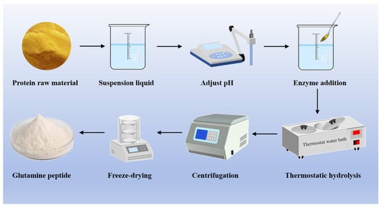 The second method for preparing glutamine peptides is the enzymatic hydrolysis of plant protein, mainly through the enzymatic hydrolysis of proteins to obtain polypeptides containing glutamine, and common raw materials for preparation are wheat, corn, potato, and so on (Figure 3) []. The yield and purity of glutamine peptides prepared by enzymatic hydrolysis are related to the preparation process, mainly influenced by the type of enzyme and hydrolysis conditions []. In 1992, Soichi Tanabe, a Japanese scholar, first used Molsin (XIII) type protease and Actinase E protease to hydrolyze wheat gluten protein to produce glutamine peptide, and the final non-nitrogen terminal Glx (glutamine and glutamic acid) content of the product reached 50.33 g/100 g []. In 1999, a nutrient solution rich in glutamine active peptides was developed []. As people paid more and more attention to food and drug safety, researchers gradually began to pay attention to the preparation of glutamine peptides by enzymatic hydrolysis of plant protein and conducted a series of studies. Food-grade proteases commonly used for the preparation of bioactive peptides (Table 1) mainly include animal proteases, plant proteases, and microbial proteases [,]. Alcalase, an endopeptidase with broad specificity for peptide bonds, exhibits minimal hydrolytic activity toward the amide groups in glutamine. Compared to other proteases, it demonstrates distinct advantages in the production of glutamine peptides []. In addition, different proteases have great differences in performance, enzymatic hydrolysis efficiency, action site, and enzymatic hydrolysis conditions due to their different sources []. Therefore, glutamine peptides can be prepared by enzymatic method with appropriate protease according to the characteristics of raw materials and actual conditions. However, in the process of enzymatic hydrolysis, not only glutamine-rich peptides can be obtained but also potentially allergenic peptides and hydrophobic peptides can be released, resulting in a bitter taste of the hydrolysate. Therefore, it is necessary to balance the relationship between hydrolysis degree and sensitization of bioactive peptides when preparing glutamine peptides by enzymatic hydrolysis.