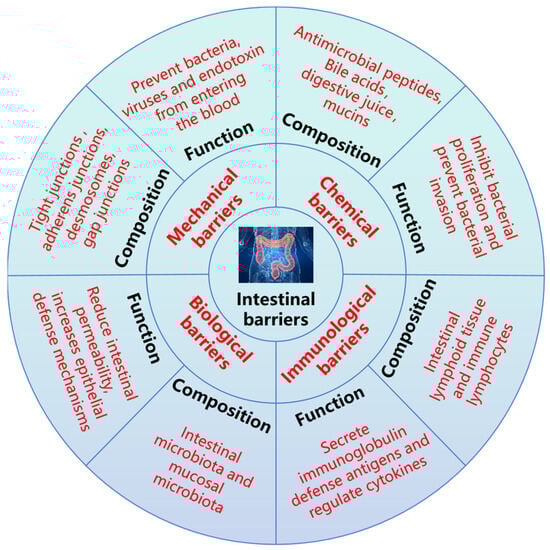 The intestinal barrier can be generally divided into the mechanical barrier, chemical barrier, immunological barrier, and biological barrier (Figure 4). These barriers have corresponding components, which play a vital role in maintaining intestinal environmental homeostasis and hindering exogenous pathogens, and they are also congenital barriers to protect body health [,,]. Under normal circumstances, these barriers cooperate to form a relatively complete defense system so that the internal environment of the body remains relatively stable, thus maintaining the normal life activities of the body.