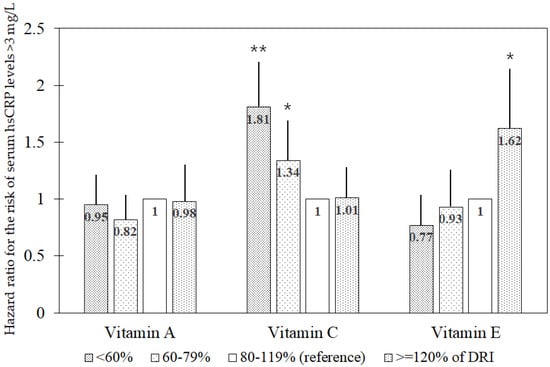 Multivariable hazard ratio for the risk of elevated serum high-sensitivity C-reactive protein concentrations (>3 mg/L) in the associations of DRI1-based groups (<60%, 60–79%, 80–119%, and ≥120% of DRI) for antioxidant vitamins. Abbreviations: DRI, dietary reference intake; hsCRP, high-sensitivity C-reactive protein. The multivariable model includes age, sex, residential district (urban or rural), educational level (≤middle school or ≥high school), income level (monthly income ≤ 2 × 106 Won or >2 × 106 Won), occupation type (office work or other), body mass index, pack-years of cigarettes (0, <20, or ≥20 pack-years), alcohol consumption (abstinent, <15 g/day, 15–30 g/day, or >30 g/day), moderate or vigorous physical activity (quintiles of metabolic equivalent-hours/day), dietary supplementation (yes or no), total calorie intake, the presence of diabetes mellitus or hypertension (yes or no), and history of cardiovascular disease or cancer (yes or no), along with dietary intake of vitamins A, C, and E. 1 Recommended daily allowance for vitamins A and C and adequate intake for vitamin E. * p < 0.05; ** p < 0.001.