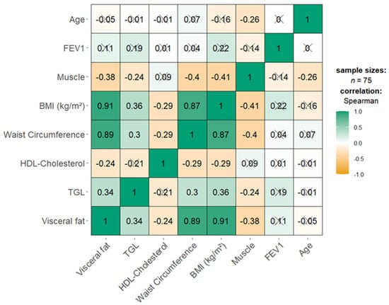 The heatmap shows the correlations between visceral fat, triglycerides (TGL), HDL cholesterol, waist circumference, BMI, muscle, FEV1, and age. Bright green indicates strong positive correlations (Spearman’s rho = 1), while bright orange signifies strong negative correlations (Spearman’s rho = −1), X = non-significant at p < 0.05.