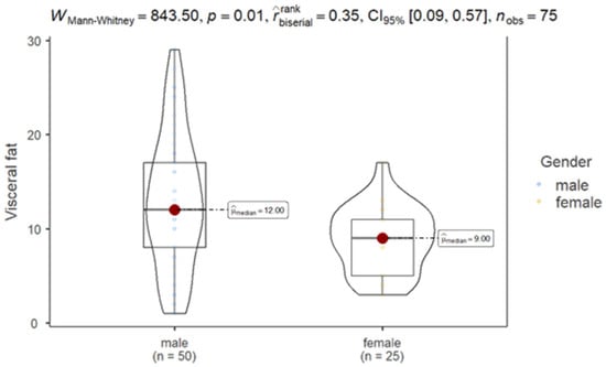 Statistical power analysis determined that a sample size of 64 participants would be necessary to detect a moderate effect size (Cohen’s d = 0.5) with 80% power at a 5% significance level []. Given our sample size of 75, this study has adequate statistical power to detect meaningful associations.
