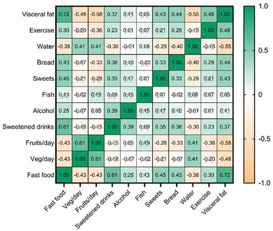 The quantification of the frequency of consumption of certain food products and lifestyle habits was carried out using the following codifications: Fast food (FF) consumption was quantified as 1—representing very rare or no consumption, 2—consumption two to three times a month, 3—consumption once a week, 4—consumption two to three times a week, and 5—daily consumption. Vegetable (Veg) and fruit (Fr) consumption was measured as 1—indicating more than three portions of 100 g per day, 2—three portions per day, 3—two portions per day, 4—one portion per day, and 5—very rare or no consumption. Sweetened and carbonated drinks (SD) were quantified as 1—very rare or no consumption, 2—two to three times a month, 3—once a week, 4—two to three times a week, 5—daily consumption of one portion (330 mL per portion), and 6—daily consumption of more than one portion. Alcohol (Alc) consumption was measured as 1—very rare or no consumption, 2—two to three times a month, 3—once a week, 4—two to three times a week, 5—daily consumption of one portion, and 6—daily consumption of more than one portion. Fish and seafood (Fish) consumption was quantified as 1—daily consumption, 2—two to three times a week, 3—once a week, 4—two to three times a month, and 5—very rare or no consumption. The consumption of sweets and pastries (Sw/part) was measured as 1—very rare or no consumption, 2—two to three times a month, 3—once a week, 4—two to three times a week, and 5—daily consumption. Bread consumption (Br) was quantified as 1—very rare or no consumption, 2—one to four slices per day, 3—five to seven slices per day, 4—eight to twelve slices per day, and 5—more than twelve slices per day. Water (Wat) consumption was measured as 1—more than three liters per day, 2—three liters daily, 3—two liters daily, 4—one liter daily, and 5—less than one liter daily. Physical activity (Ex) was quantified as 1—daily exercise of at least one hour, 2—daily exercise of less than one hour, 3—two to three times a week, 4—very rare exercise, and 5—no exercise.