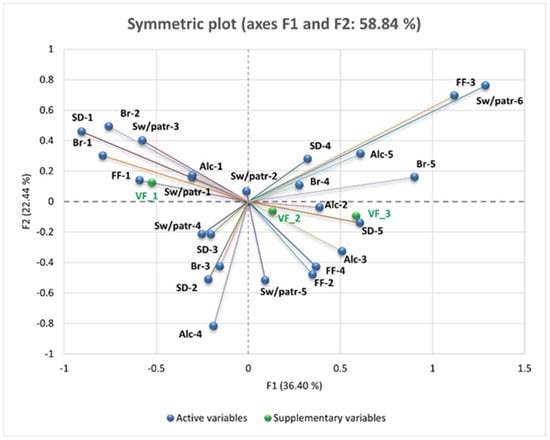 The PCA model accounted for 56.99% of the total variance in the dataset, with the first principal component (F1) explaining 32.06% and the second principal component (F2) capturing 24.93%. Notably, VF_3 was strongly correlated with daily fast food consumption (FF-5), sweets and pastries (Sw/patr-5), and alcoholic beverages (Alc-5), reinforcing the detrimental impact of high-caloric, processed foods on visceral adiposity. In contrast, VF_1 was negatively associated with these unhealthy eating habits and positively correlated with daily physical activity (Ex-1) and minimal sweets consumption (Sw/patr-1), suggesting that exercise and dietary moderation contribute to lower VF levels.