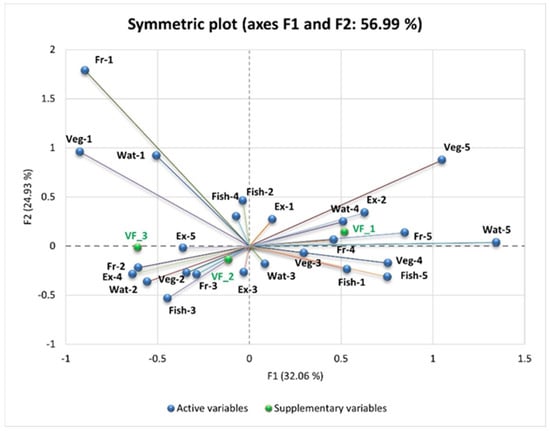 We performed Principal Component Analysis (PCA) to explore the relationships between VF levels and dietary habits such as the consumption of vegetable products, fruits, fish, water, fast food, sweets or pastries, bread, sweetened and carbonated drinks, and alcohol, as well as physical activity.
