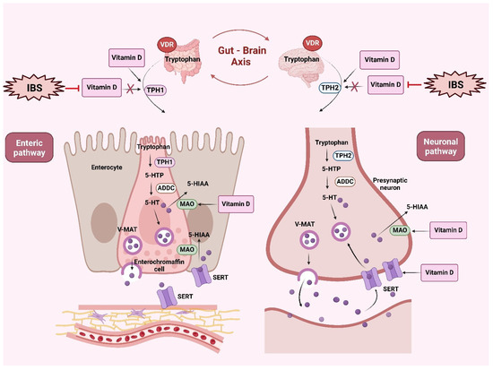 Serotonergic metabolism in Irritable Bowel Syndrome (IBS) and the modulatory role of vitamin D. Figure 2 illustrates the interplay between vitamin D and serotonergic signaling in the gut–brain axis, highlighting its implications in Irritable Bowel Syndrome (IBS). On the left, the enteric pathway is depicted, where tryptophan is converted to 5-hydroxytryptophan (5-HTP) by tryptophan hydroxylase 1 (TPH1) in enterochromaffin cells, and then to serotonin (5-HT) by aromatic L-amino acid decarboxylase (ADDC). Serotonin is stored in vesicles via the vesicular monoamine transporter (V-MAT) and released into the intestinal lumen and bloodstream, where it regulates gut motility and sensation. The serotonin transporter (SERT) facilitates serotonin reuptake, while excess serotonin is degraded to 5-hydroxyindoleacetic acid (5-HIAA) by monoamine oxidase (MAO). Vitamin D modulates this pathway by influencing TPH1 expression and regulating both SERT and MAO activity. Additionally, the activation of the vitamin D receptor (VDR) in the enteric pathway can upregulate TPH1 expression, enhancing serotonin synthesis from tryptophan. Conversely, vitamin D deficiency is potentially associated with downregulation of TPH1 and disruption of serotonin balance, exacerbating IBS symptoms. On the right, the neuronal pathway of the gut–brain axis is shown, where tryptophan is converted to serotonin through TPH2 and ADDC in presynaptic neurons. Serotonin is stored in vesicles via V-MAT, released into the synaptic cleft, and reabsorbed through SERT. Vitamin D, acting via the VDR, modulates TPH2 and SERT expression, thereby influencing serotonin turnover. Overall, the figure highlights how vitamin D, through its effects on TPH1, TPH2, SERT, and MAO, plays a crucial role in regulating serotonin availability, which affects gut motility, visceral sensitivity, and mood. Furthermore, in this figure we suggest that vitamin D deficiency may disrupt serotonergic signaling, exacerbating IBS symptoms and contributing to the gut–brain axis imbalance observed in IBS patients. Created with BioRender.com (accessed on 13 February 2025). Abbreviations: IBS, irritable bowel syndrome; VDR, vitamin D receptor; TPH1, tryptophan hydroxylase-1; 5-HT, serotonin; 5-HTP: 5-hydroxytryptophan; ADDC, aryldialkylamine N-acyltransferase; 5-HIAA: 5-hydroxyindoleacetic acid; MAO, monoamine oxidase; SERT, serotonin transporter; V-MAT, vesicular monoamine transporter.