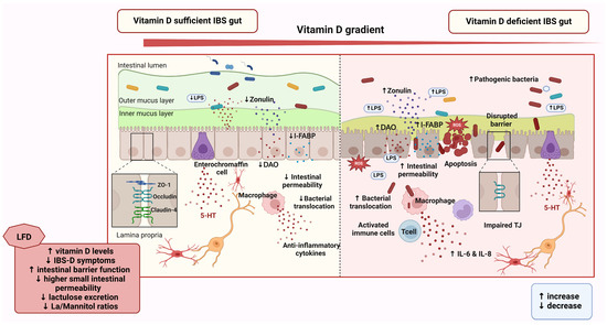 Proposed impact of vitamin D on intestinal barrier integrity in IBS pathophysiology. Figure 3 illustrates the differential effects of sufficient and deficient vitamin D levels on the intestinal barrier and gut–brain axis in IBS. On the left, vitamin D sufficiency is associated with reduced intestinal permeability, lower bacterial translocation, and increased tight junction (TJ) integrity, as evidenced by elevated levels of TJ proteins such as ZO-1, occludin, and claudin-4. Enterochromaffin cells regulate serotonin (5-HT) release, while macrophages produce anti-inflammatory cytokines, contributing to gut homeostasis. On the right, vitamin D deficiency leads to increased zonulin, I-FABP, and DAO levels, resulting in disrupted TJs (including reduced ZO-1 expression), bacterial translocation, and increased IL-6, IL-8, and LPS levels, exacerbating inflammation. Apoptosis and oxidative stress further impair the barrier. The LFD enhances vitamin D levels, decreases IBS-D symptoms, and improves intestinal barrier function by lowering permeability markers (lactulose excretion and La/Mannitol ratio), zonulin, I-FABP, and DAO, further reducing inflammation (IL-6, IL-8) and LPS levels. Together, these findings highlight the potential of vitamin D modulation and dietary interventions in managing IBS-D and gut–brain axis dysfunction. Created with BioRender.com (accessed on 4 March 2025). Abbreviations: IBS, irritable bowel syndrome; LPS, lipopolysaccharides; I-FABP, intestinal-type fatty acid-binding protein; DAO, diamine oxidase; 5-HT, serotonin; ZO-1, zonula occludens-1; IL-6, interleukin-6; TJ, tight junction; LFD, low-fermentable oligosaccharides, disaccharides, monosaccharides, and polyol (FODMAP) diet.