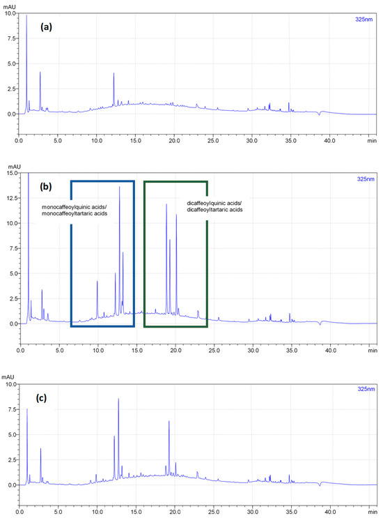 Representative UHPLC-PDA chromatograms at 325 nm of the chicory root extracts obtained using three methods: (a) pectinase-assisted extraction (Method 1); (b) pressure-assisted extraction (Method 2); (c) combined pectinase-assisted and pressure-assisted extraction (Method 3). The boxes drawn in chart (b) show the elution range of monocaffeoyl and dicaffeoyl derivatives.