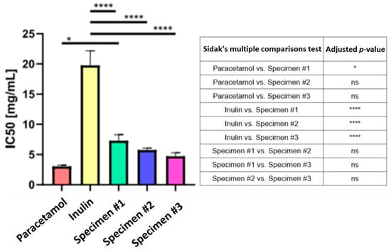 IC50 for 3 chicory extracts (Specimen #1, Specimen #2, Specimen #3), paracetamol, and inulin. Statistical significance was assessed using GraphPad Prism v8 (GraphPad Software, San Diego, CA, USA) with a post hoc analysis. **** p < 0.0001, *** p < 0.001, ** p < 0.01, and * p < 0.05 were considered as significant.