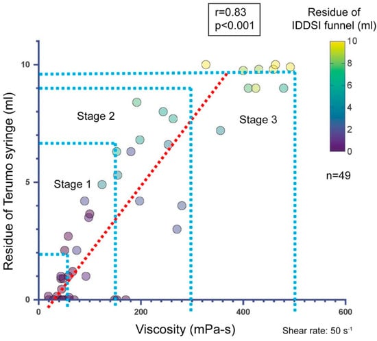 The relationship between the viscosity and residual volume is shown in Figure 1 and Figure 2. The viscosity measured using the E-type viscometer and the residual volume of the Terumo syringe showed a high correlation (r = 0.83, p < 0.001, Spearman’s rank correlation analysis) (Figure 1). However, when the value obtained using the Terumo syringe test was classified according to the JDD2021 classification, the following results were obtained for the samples: 92% of the samples classified as stage 1 or less (residual volume of 0 to 2.2 mL or less) in the Terumo syringe test fell into the 0–50-mPa·s range in the viscosity measurement and 46% of the samples classified as stage 1 (residual volume of 2.2 to 7.0 mL) in the Terumo syringe test fell into the 50–150-mPa·s range in the viscosity measurement. Only 23% of the samples classified as stage 2 (7.0 to 9.5 mL residual volume) in the Terumo syringe test fell in the 150–300-mPa·s range in the viscosity measurement, and only 40% of the samples classified as stage 3 (9.5 to 10 mL residual volume) in the Terumo syringe test fell in the 300–500-mPa·s range in the viscosity measurement.