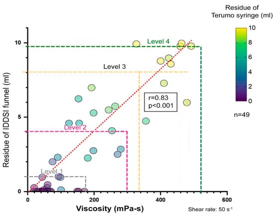 Figure 1. Relationship between viscosity and residue of the Terumo syringe. Viscosity was measured using an E-type viscometer, and the residue was measured with a Terumo syringe (correlation coefficient: r = 0.83, p < 0.001, Spearman’s rank correlation analysis). The color in the circle indicates the residual volume of the IDDSI funnel with the same sample.