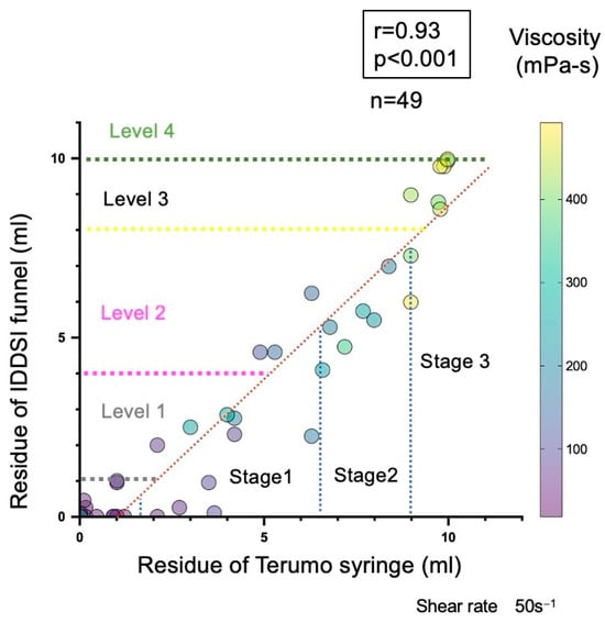 Similarly, the viscosity measured using the E-type viscometer and the residual volume of the IDDSI funnel showed a high correlation (r = 0.83, p < 0.001, Spearman’s rank correlation analysis) (Figure 2). The residual volumes of the Terumo syringe and IDDSI funnel showed an even higher correlation (r = 0.93, p < 0.001, Spearman’s rank correlation analysis) (Figure 3). The distribution of the 49 samples on JDD2021 and IDDSI ver2.0 is shown in Table 3.