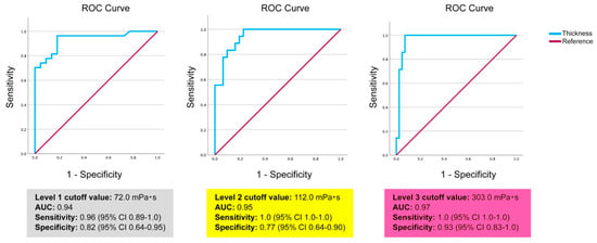 Results of the ROC analysis to determine the cutoff for IDDSI levels 1, 2, and 3 using the viscosity and the date of funnel residue from 49 samples. The cutoffs were determined at maximum sensitivity and specificity.