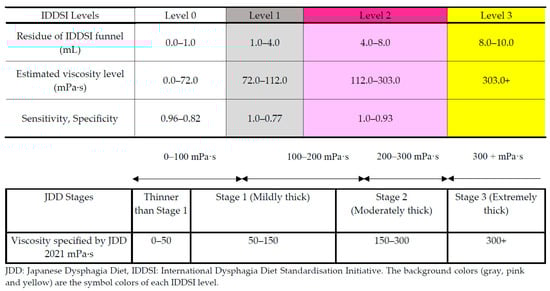Our study clarified the relationship between the JDD2021 and IDDSI based on viscosity (mPa·s) and IDDSI funnel residue (mL), which is as follows: