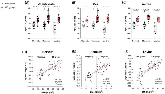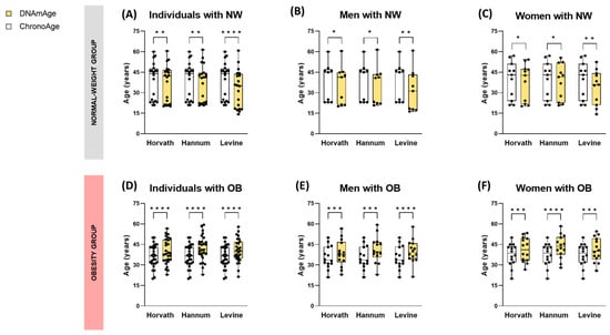 When evaluating the differences observed by stratifying individuals according to sex, the discrepancies detected in the groups between DNAmAge and ChronoAge were similar when comparing men and women (p < 0.05 in the normal-weight group; p < 0.001 in the obesity group) (Figure 1B,C,E,F).