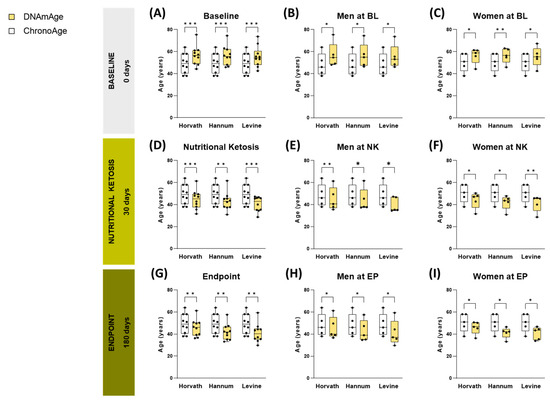 Analysis of the epigenetic clock in the longitudinal cohort. Boxplots of chronological age (ChronoAge) (white) versus DNA methylation age (DNAmAge) (yellow) values, estimated by the 3 epigenetic predictors, comparing the different phases of the follow-up of a VLCKD in patients with obesity: baseline (BL) (A–C), nutritional ketosis (NK) (D–F) and endpoint (EP) (G–I). Each bar graph represents the mean value standard deviation, and asterisks indicate significant differences according to the paired t-test corrected for multiple comparisons using the Holm-Šídák (*: p < 0.05; **: p < 0.01; ***: p < 0.001).