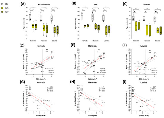 Analysis of the acceleration of biological age in the longitudinal cohort. Boxplots of epigenetic age acceleration (AgeAcell) values in patients with obesity following a VLCKD, comparing baseline (BL) (gray), nutritional ketosis (NK) (light green) and endpoint (EP) (dark green), estimated by the 3 epigenetic predictors, using a repeated measures ANOVA test applying a Bonferroni post hoc analysis (*: p < 0.05; **: p < 0.01; ****: p < 0.0001) (A–C). Scatter plot with a line of best fit showing the association of age acceleration (AgeAccel) with body mass index (BMI) (D–F) and with β-hydroxybutyrate (β-OHB) levels (G–I), using the Spearman correlation coefficient (r) (p-value < 0.05) for each of the epigenetic clocks.