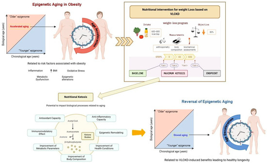 Notably, this significant deceleration of estimated biological age in patients with obesity undergoing a VLCKD has not been observed in other body weight loss interventions. Specifically, after bariatric surgery, despite achieving significant and comparable body weight loss to that achieved with VLCKD, no notable differences were detected in the decrease in biological age of patients with obesity after surgical intervention [43]. These results are also in line with previous studies where we determined that VLCKD was able to modulate inflammatory state oxidative stress and improve innate immunity more effectively than with a hypocaloric diet or bariatric surgery [37]. Therefore, based on these observations, we propose that the effect of reversing the acceleration of biological age in patients with obesity undergoing VLCKD could be primarily mediated by diet-induced ketosis through epigenetic reprogramming or resetting. Overall, our findings underscore the therapeutic potential of VLCKD in the treatment of obesity, beyond body weight loss, as this nutritional strategy not only provides metabolic, anti-inflammatory, and antioxidant benefits but also and relevantly may have the capacity to modulate biological aging through epigenetic mechanisms, postulating it as a comprehensive therapeutic tool in the management of obesity and its associated complications (Figure 5).