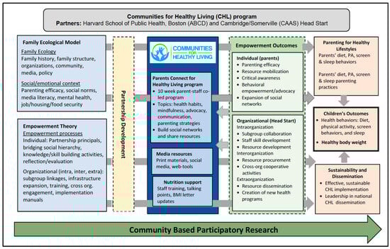 - Beckerman, J.P.; Aftosmes-Tobio, A.; Kitos, N.; Jurkowski, J.M.; Lansburg, K.; Kazik, C.; Gavarkovs, A.; Vigilante, A.; Kalyoncu, B.; Figueroa, R.; et al. Communities for healthy living (CHL)—A family-centered childhood obesity prevention program integrated into Head Start services: Study protocol for a pragmatic cluster randomized trial. Contemp. Clin. Trials 2019, 78, 34–45. [Google Scholar] [CrossRef]