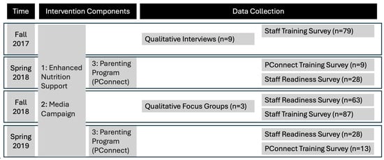 Data collection procedures were previously described in detail [] and the data collection timeline is summarized in Figure 2. Briefly, data were collected through surveys, interviews, and focus groups between September 2017 and June 2019, in alignment with fall (September–December) and spring (April–June) semesters at Head Start.