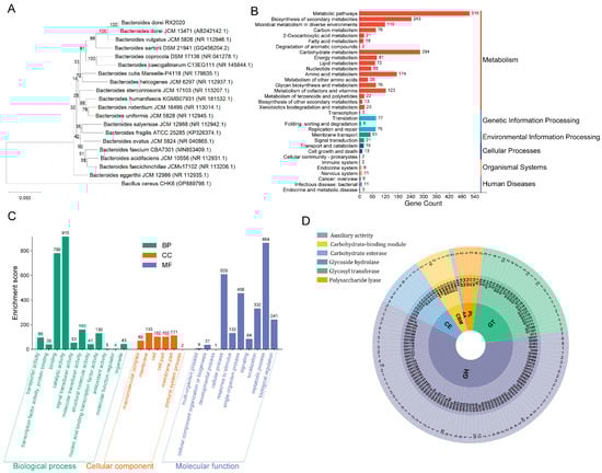 The gene function annotations of the B. dorei. (A) A phylogenetic tree constructed using a 16S rRNA sequence (neighbor-joining method). (B) KEGG database annotation results. (C) GO database annotation results. (D) Classification of the predicted CAZy from B. dorei.