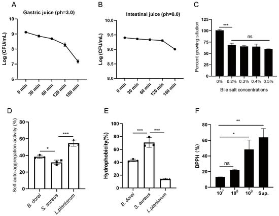 Evaluation of probiotic characteristics of B. dorei. (A) Evaluation of tolerance to artificial gastric juices. (B) Evaluation of tolerance to artificial intestinal juice. (C) Percentage of survival at different bile salt concentrations; (D,E) Auto-aggregation and hydrophobicity activity of B. dorei; (F) DPPH radical scavenging assay (Sup: the cell-free culture supernatant of B. dorei). The statistical analyses were assessed using Student’s t-test and one-way ANOVA. Statistical significance was defined as * p < 0.05, ** p < 0.01, and *** p < 0.001.