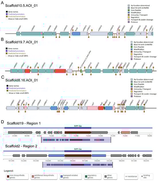 Bacteriocin gene clusters of isolated B. dorei. (A–C) Bacteriocin gene clusters of isolated B. dorei strain identified using BAGEL 4; (D) Bacteriocin gene clusters of isolated B. dorei strain identified using antiSMASH.