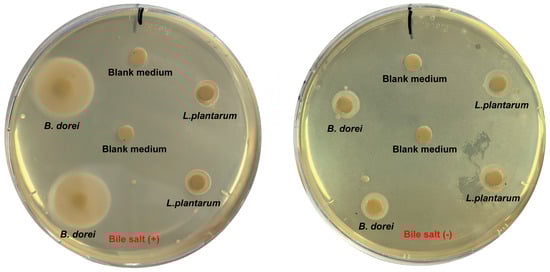 Bile salt plates were prepared following Haleem et al.’s method [29] by supplementing anaerobic broth medium with 7.5 g/L agar, 0.3% (w/v) bile salt (Thermo Scientific™ Oxoid, Basingstoke, UK), and 0.375 g/L CaCl2. Sterile 6 mm filter paper disks were placed on the plates and inoculated with 10 μL of either sterile medium (control), B. dorei, or L. plantarum suspensions. Following 48–72 h incubation at 37 °C, precipitation ring formation was evaluated.