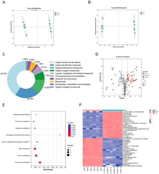 To explore the metabolic activity of B. dorei, its culture supernatant was subjected to metabolomics. A partial least squares-discriminant analysis (PLS-DA) model demonstrated that metabolome samples from extracellular metabolites of B. dorei could be clearly separated from those treated with a culture medium (control) (Figure 6A). The Orthogonal Partial Least Squares-Discriminant Analysis (OPLS-DA) model demonstrated both stability and good predictive performance, as indicated by its R2Y (1) and Q2 (0.994) values close to 1 (Figure 6B). Analysis of Human Metabolism Database (HMDB) data showed that organic acids and derivatives accounted for the highest proportion (about 44.1%), indicating that bacterial metabolism is dominated by organic acid synthesis. Lipids and lipid-like molecules accounted for 22.6%, suggesting that membrane lipid metabolism is active (Figure 6C). Lipids not only have structural roles but also have potential effects on host health and physiology [42]. The volcano plot showed that there were 49 up-regulated metabolites and 28 down-regulated metabolites (fold change ≥1.2 or ≤0.8, p < 0.05, VIP ≥ 1) (Figure 6D). KEGG pathway analysis revealed significant enrichment in nucleotide metabolism, ABC transporters, purine and pyrimidine metabolism, and galactose metabolism (Figure 6E). The co-enrichment of these pathways suggests comprehensive metabolic reprogramming in the bacteria, characterized by enhanced energy production, active cellular proliferation, and adaptive responses to environmental challenges.
