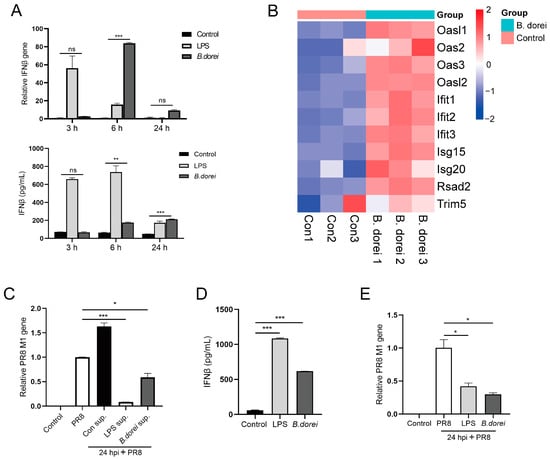 Immunomodulatory activity of B. dorei. (A) BMDCs were pretreated with B. dorei (MOI 10) for 3, 6, and 24 h. Relative IFNβ gene expression to β actin in BMDCs; IFNβ expression in culture supernatants from BMDCs. (B) Heat map of ISG and IFN gene expression. (C) Relative PR8 M1 gene expression to β actin in MLE12 cells. (D) IFNβ expression in culture supernatants from BMDMs. (E) Relative PR8 M1 gene expression to β actin in BMDMs. The statistical analyses were assessed using one-way ANOVA. Statistical significance was defined as * p < 0.05, ** p < 0.01, *** p < 0.001, and ns p > 0.5.