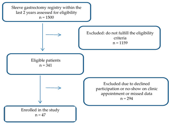 A total of 47 patients (18 males and 29 females) were enrolled in this study (Figure 1). The median age of participants was 35.0 ± 22 years. Most of the patients were literate and single. Around 69.6% had the surgery within the last year, and 74.5% reported having other medical conditions. Most patients took multivitamins (72.3%), but few used protein supplements (12.8%). Based on the NRS-2002 criteria, 72.3% of patients were at risk of malnutrition. The demographic and nutritional characteristics of the study patients are shown in Table 1.