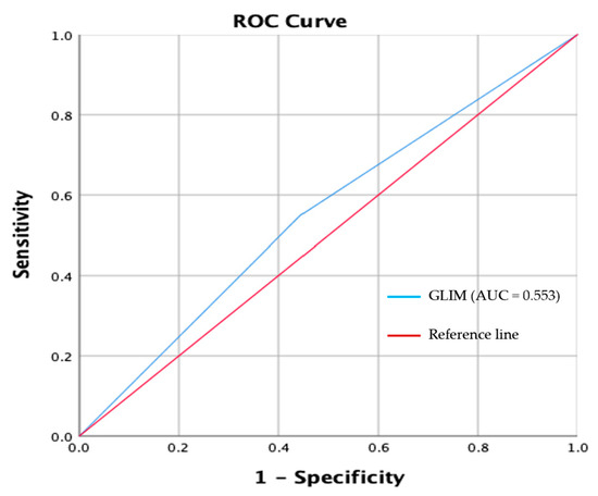 GLIM criteria showed poor agreement with SGA (κ = 0.10, p = 0.474). ROC analysis showed that GLIM criteria had a poor sensitivity (55.0%) and specificity (55.6%) compared with SGA. The AUC clearly showed the failed ability of the GLIM criteria to diagnose malnutrition when compared with SGA (AUC = 0.553; 95% CI, 0.38–0.72) (Figure 2).