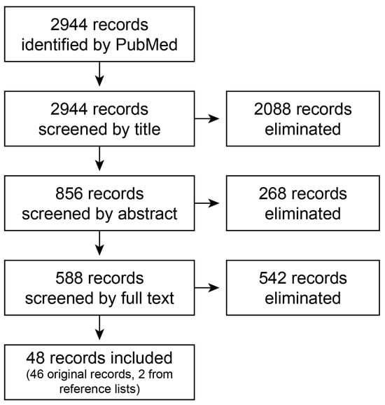 The PubMed search, conducted on 20 October 2022, returned 2944 results. We followed PRISMA-ScR (Preferred Reporting Items for Systematic reviews and Meta-Analyses extension for Scoping Reviews) guidelines when performing our scoping review. As detailed in Table 3, articles were included based on title, then abstract, then the full text. Final decisions were made based on inclusion and exclusion criteria. Inclusion and exclusion criteria were periodically addended as new issues arose. Once articles meeting study criteria were identified, their reference lists were reviewed and the process repeated. In total, 48 manuscripts—46 from the original screening process and 2 from reference lists were used for this review (see Figure 1).