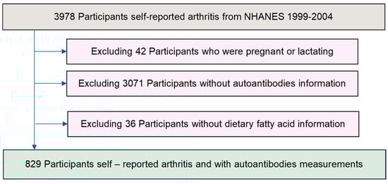 APA StyleGuo, J., Yu, Y., Su, J., Ren, F., & Chen, J. (2025). Dietary Fatty Acids and Antinuclear Antibodies Among Adults with Arthritis in the United States: NHANES 1999–2004. Nutrients, 17(6), 934. https://doi.org/10.3390/nu17060934