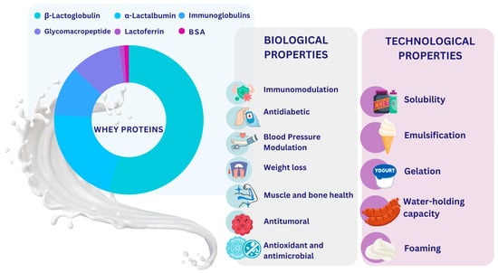 Whey proteins (WPs) are predominantly composed of β-lactoglobulin (β-LG) and α-lactalbumin (α-LA), along with minor fractions, including bovine serum albumin (BSA), immunoglobulins (IGs) and lactoferrin (LF), and have a high biological value, representing a rich source of essential and branched-chain amino acids [1,2,3]. The nutritional and physiological benefits of WP-based foods are well known, as previously documented [4,5,6]. In addition to their remarkable nutritional properties, WPs display significant techno-functional characteristics, including solubility, emulsification, gelling and foaming properties, as depicted in Figure 1, which are of considerable value in food formulation [2,3]. WP processing by conventional methods (hydrolysis, fermentation) and green technologies (ultrasound, microwave, hydrostatic pressure, pulsed electric field and subcritical water) release peptides with healthy properties [7]; recently, in silico approaches have been used to discover and investigate the biological activity of bioactive peptides (BAPs), increasing their yield and activity, improving their stability and reducing time for their production, identification and separation [8].