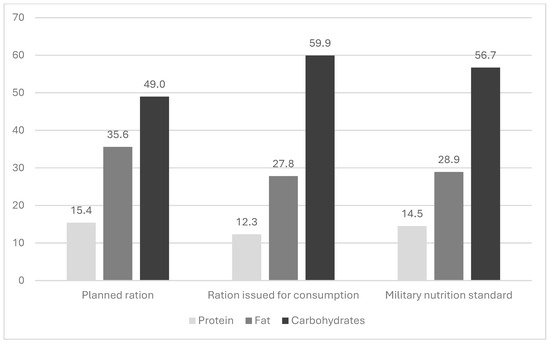 The nutritional requirements of navy sailors differ from those of ground forces because they work in a closed environment and because of the logistical constraints associated with cooking and storing food. Therefore, it is very important to ensure the supply of appropriate energy through food rations to balance the energy expenditure of navy ship crews. On the other hand, an adequate supply of macronutrients, i.e., proteins, fats, and carbohydrates, in terms of both quantity and appropriate proportions plays an important role. The present study showed a disproportion between the supply of proteins, fats, and carbohydrates in both planned and given for consumption rations, which disturbed the correct proportions between them. Previous examinations of rations used in the nutrition of Polish soldiers indicated this problem [42]. These disproportions are due to Polish dietary habits, which favor the use of large amounts of fats in meal preparation technology, as well as increasing the energy value of food rations by adding fats. For comparison, the energy value of rations used in the nutrition of Indian Navy ship crews amounted to 3518 ± 286 kcal/day, with the proportion of energy coming from carbohydrates, fats, and proteins being 59.9%, 27.8%, and 12.3%, respectively [33].