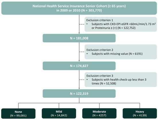 This nationwide, retrospective, observational study was performed using data from the NHIS-Senior cohort between 2009 and 2018, which was established to support research on older adults in Korea [23]. We initially included 303,770 individuals aged ≥ 65 years who underwent a health examination between 2009 and 2010 and had baseline data on alcohol consumption. The cohort was followed up through December 2018 annually to collect anthropometric, sociodemographic, and medical information, including outcomes, and biennially to gather laboratory data from health checkups. Subjects were excluded if they (1) had a baseline estimated glomerular filtration rate (eGFR) < 60 mL/min per 1.73 m2 and/or baseline dipstick proteinuria ≥ 1 + (n = 122,752), (2) had any missing data (n = 6191), or (3) received less than three health screenings during this period (n = 52,508). Finally, health screening data was examined from 122,319 participants enrolled in the present study (Figure 1).