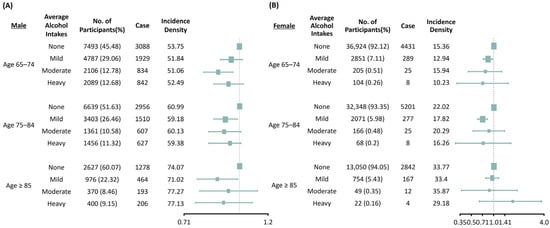 Subgroup analysis of the risks of chronic kidney disease based on age and amounts of alcohol consumption in males (A) and females (B). Adjusted for age, sex, body mass index, systolic blood pressure, smoking, exercise, diabetes mellitus, hypertension, cerebrovascular disease, heart failure, dyslipidemia, fasting glucose, total cholesterol, low-density lipoprotein cholesterol, alanine aminotransferase, baseline estimated glomerular filtration rate (CKD–EPI).