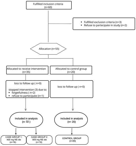 A total of 60 women with essential uncomplicated hypertension initially met the inclusion criteria. However, five patients (8.3%) declined to participate. Of the remaining 55 participants, 3 subjects (5.5%) from the NS group discontinued the study due to forgetfulness (2 participants; 3.6%) and voluntary withdrawal (1 participant; 1.8%). Thus, an overall sample of 52 patients (86.7%) completed the study, comprising 32 participants in the NS group (61.5%) and 20 participants in the control group (38.5%), as shown in Figure 1.