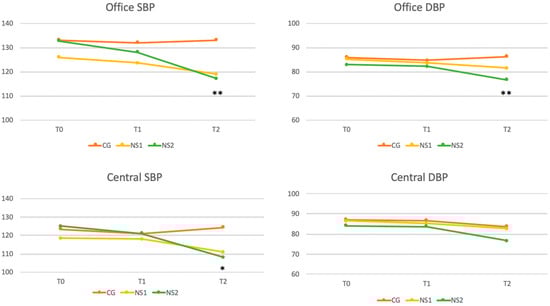 At the end of the follow-up period, after eight weeks (T2) of observation compared to baseline values, statistically significant differences were for systolic (p = 0.002) and diastolic (p = 0.008) brachial BP and pulse pressure (p = 0.048). Moreover, central systolic (p = 0.016) BP values were statistically significantly reduced compared with the beginning. On the other hand, diastolic (p = 0.523) BP and pulse pressure (p = 0.051) exhibited a slight reduction but did not reach statistical significance in some comparisons (Figure 2).
