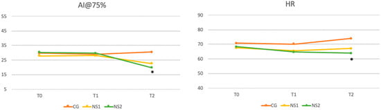 A significant reduction in diastolic BP was also observed between CG and NS2 (p = 0.00016), while no significant differences were found between CG and NS1 or NS1 and NS2. Pulse pressure comparisons revealed significant differences between CG and NS1 (p = 0.03) and between NS1 and NS2 (p = 0.0007). The analysis demonstrated significant differences in Central SBP between CG and both NS1 (p = 0.023) and NS2 (p = 0.0009), with no significant difference between NS1 and NS2. A significant reduction in heart rate was observed between CG and NS2 (p = 0.005). Finally, AI@75%, resulted significantly reduced in NS2 compared to CG (p = 0.018), with no significant differences for other group comparisons. All these comparisons are reported in Table 4.