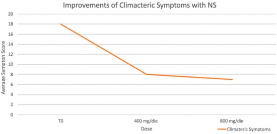 Moreover, an improvement in climacteric symptoms (GCS) was reported by patients in both treatment groups. As shown in Figure 4, significant improvement in climacteric symptoms, as measured by the Greene Climacteric Scale, was observed during the observation. With a maximum possible score of 60, symptom severity significantly decreased from a baseline average of 18 to 8 with a 400 mg/day dose and further to 7 with an 800 mg/day dose (* p < 0.05 for both reductions).