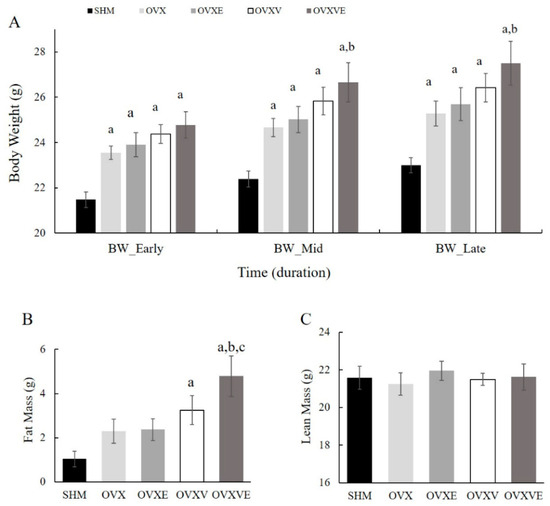 Body composition. (A) Changes in body weight between groups per period, (B) differences in fat mass between groups, and (C) differences in lean mass between groups. Values are means ± SE. a a significant difference compared to the SHM group; b a significant difference compared to the OVX group; c a significant difference compared to the OVXE group. SHM: sham group; OVX: ovariectomy group; OVXE: ovariectomy with exercise; OVXV: ovariectomy with vitamin E; OVXVE: ovariectomy with exercise and vitamin E; BW: body weight.