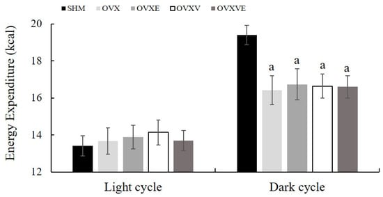 Resting metabolic rate. Energy expenditure during the light and the dark cycle. Values are means ± SE. a a significant difference compared to the SHM group. SHM: sham group; OVX: ovariectomy group; OVXE: ovariectomy with exercise; OVXV: ovariectomy with vitamin E; OVXVE: ovariectomy with exercise and vitamin E.