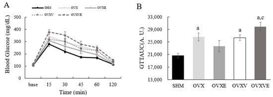 Glucose tolerance test. (A) Blood glucose kinetics during glucose tolerance test and (B) area under the curve during the glucose tolerance test. Values are means ± SE. a a significant difference compared to the SHM group; c a significant difference compared to the OVXE group. SHM: sham group; OVX: ovariectomy group; OVXE: ovariectomy with exercise; OVXV: ovariectomy with vitamin E; OVXVE: ovariectomy with exercise and vitamin E; GTTAUC: glucose tolerance test area under the curve.