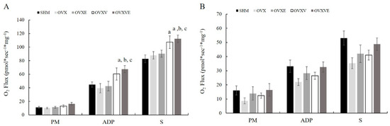Mitochondrial function in skeletal muscle. (A) The oxygen consumption in the soleus and (B) gastrocnemius muscle. Values are means ± SE. a a significant difference compared to the SHM group; b a significant difference compared to the OVX group; c a significant difference compared to the OVXE group. SHM: sham group; OVX: ovariectomy group; OVXE: ovariectomy with exercise; OVXV: ovariectomy with vitamin E; OVXVE: ovariectomy with exercise and vitamin E; PM: pyruvate and malate; ADP: adenosine diphosphate; S: succinate.